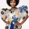 Bold, feminine, and unapologetically extra — Bloom Command is the collared puff-sleeve blouse designed for the woman who refuses to blend in. The sheer body is embroidered with oversized metallic florals that shift beautifully in the light, while the dramatic sleeves sculpt your silhouette with couture-level presence. Wear it buttoned for polished drama or slightly open for a softer, flirtier edge. This top brings art, attitude, and elegance together in one unforgettable piece.