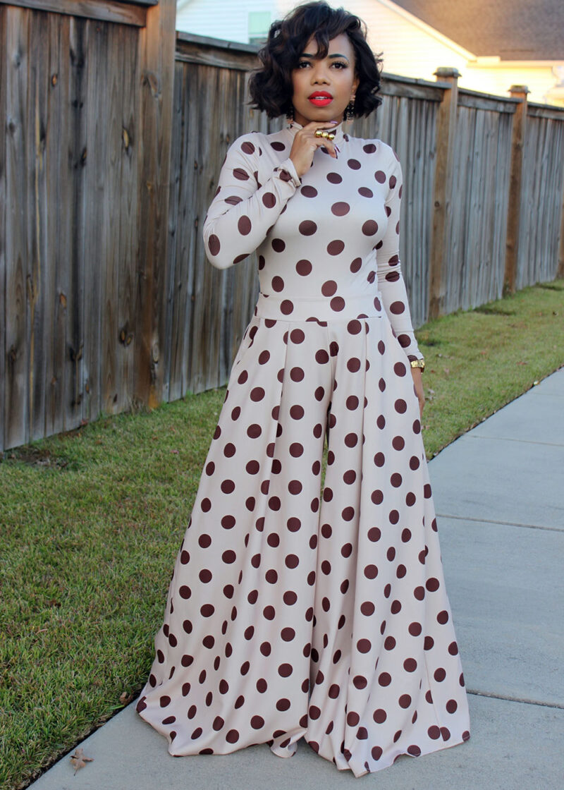 Sophisticated doesn’t have to mean silent. Dippin’ Dots is your bold throwback moment reimagined for today’s woman. Featuring a fitted mock-neck bodysuit and high-waisted palazzo pants, this two-piece set moves with ease while keeping its structure.