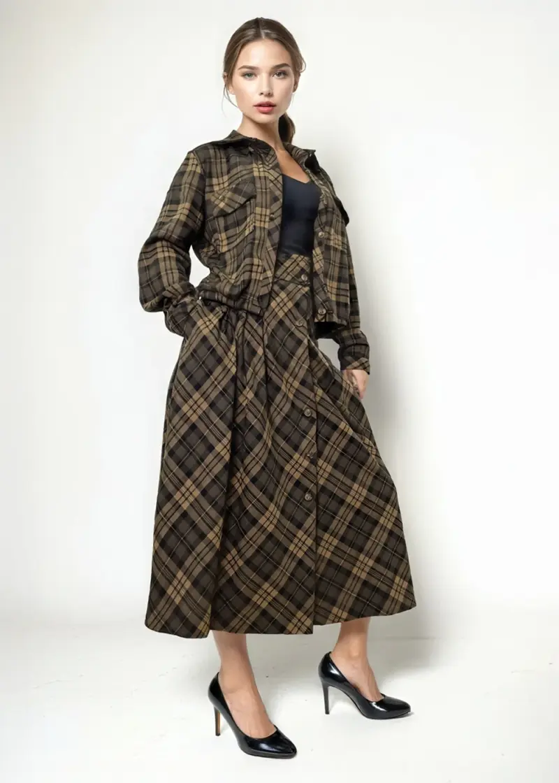 A fall favorite that makes plaid feel fresh again. This 2-piece set blends timeless tailoring with a modern edge. The A-line skirt, crafted from a soft cotton blend, features a full button-down front, functional side pockets, and a below-the-knee cut that’s both modest and magnetic. The matching button-down top comes with a structured collar, cuffed long sleeves, front pockets, and a cinched elastic hem for a flattering, slightly cropped finish. Together, they strike the perfect balance between effortless comfort and classic cool.