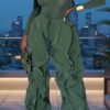 Command attention in monochrome. This statement set pairs oversized, wide-leg ruffle joggers with a sleek, body-hugging stretch bodysuit for a look that’s both fearless and fluid. The olive tone flatters every complexion, while the exaggerated leg detail adds architectural movement that turns sidewalks into runways.