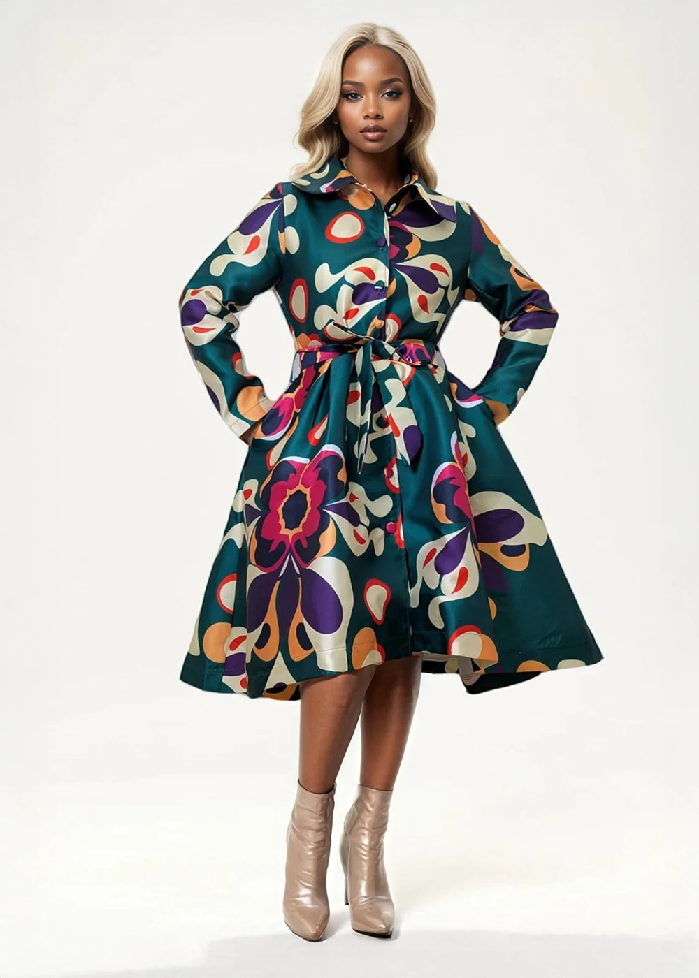 Meet the statement dress that plays by its own rules. This exclusive midi dress features a button-down, jacket-style front with covered buttons, long sleeves, and a sharp collared neckline for that polished finish. The pleated waistline flatters the silhouette while the hi-lo hem adds graceful movement with every step. Crafted with functional pockets (because style and utility belong together), the vibrant floral print brings modern femininity to a classic shape — perfect for everything from brunch to boardroom to after-hours flair.
