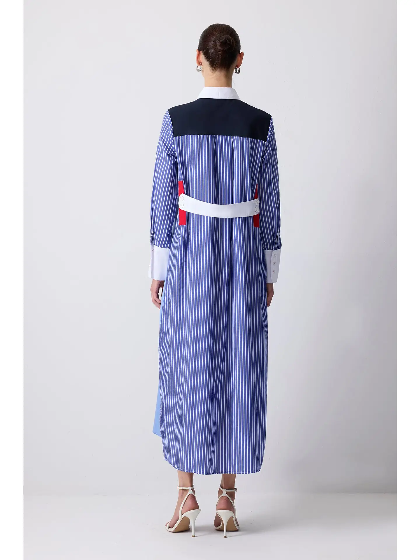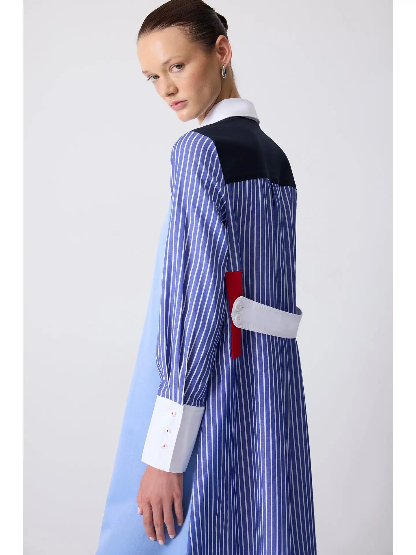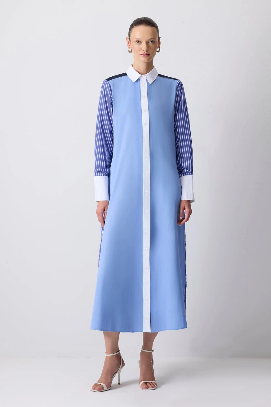 Make a bold statement with this color block shirt dress, designed for the modern woman who values both structure and style. Featuring a sleek front in solid sky blue and contrasting pinstriped sleeves, this dress exudes polished sophistication. The crisp white collar and wide cuffs add tailored definition, while the dramatic color-blocked back—with navy paneling, red accents, and a white belt detail—creates a visually striking contrast. The longline silhouette offers graceful movement, making it perfect for elevated workwear, day-to-night transitions, or standout street style moments. Crafted from breathable, structured fabric, it combines comfort with contemporary design. Style it with heels for a refined office look or sneakers for a laid-back yet chic ensemble. Ideal for minimalist wardrobes with a twist, this dress is a must-have for fashion-forward dressers seeking a timeless statement piece.