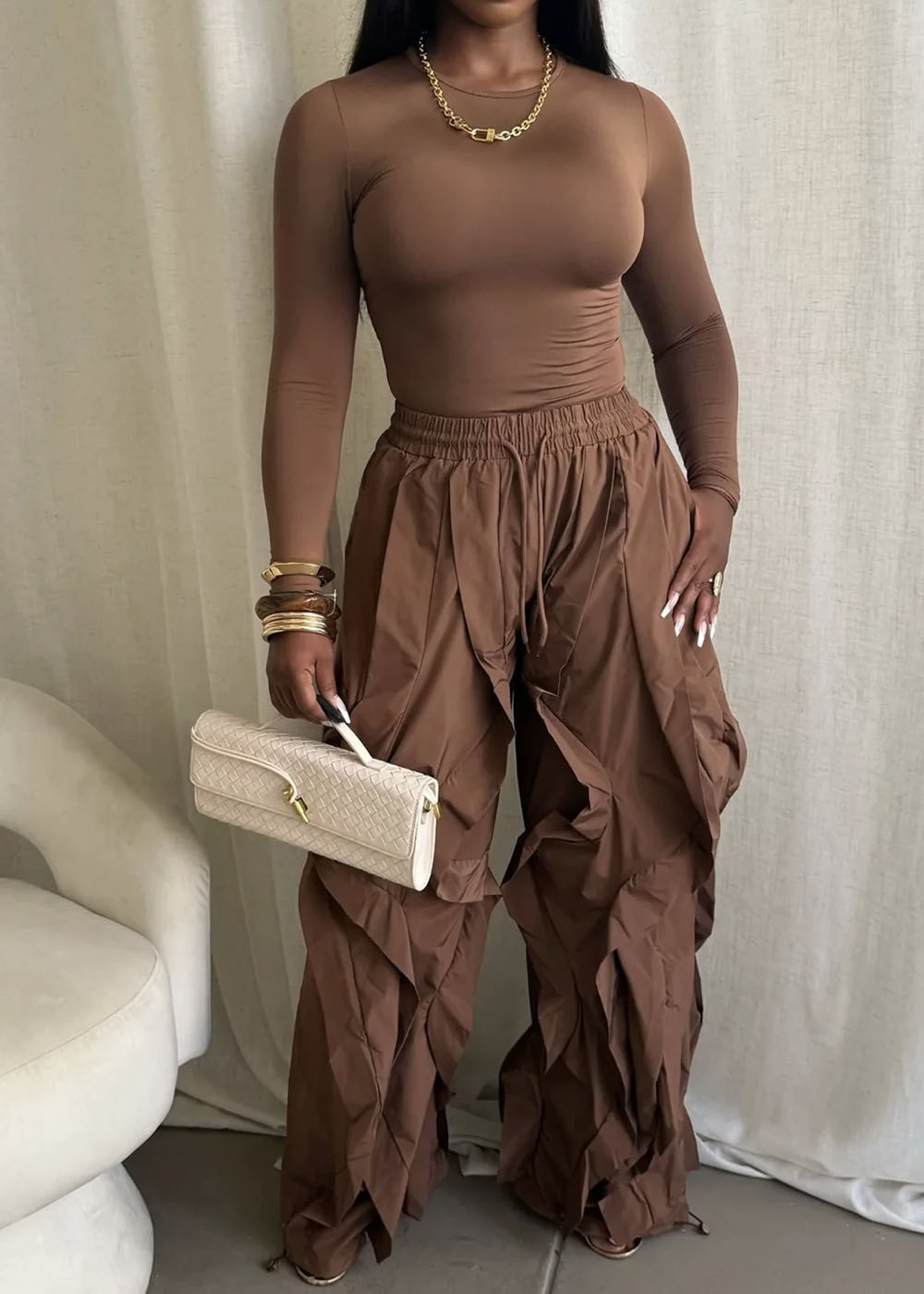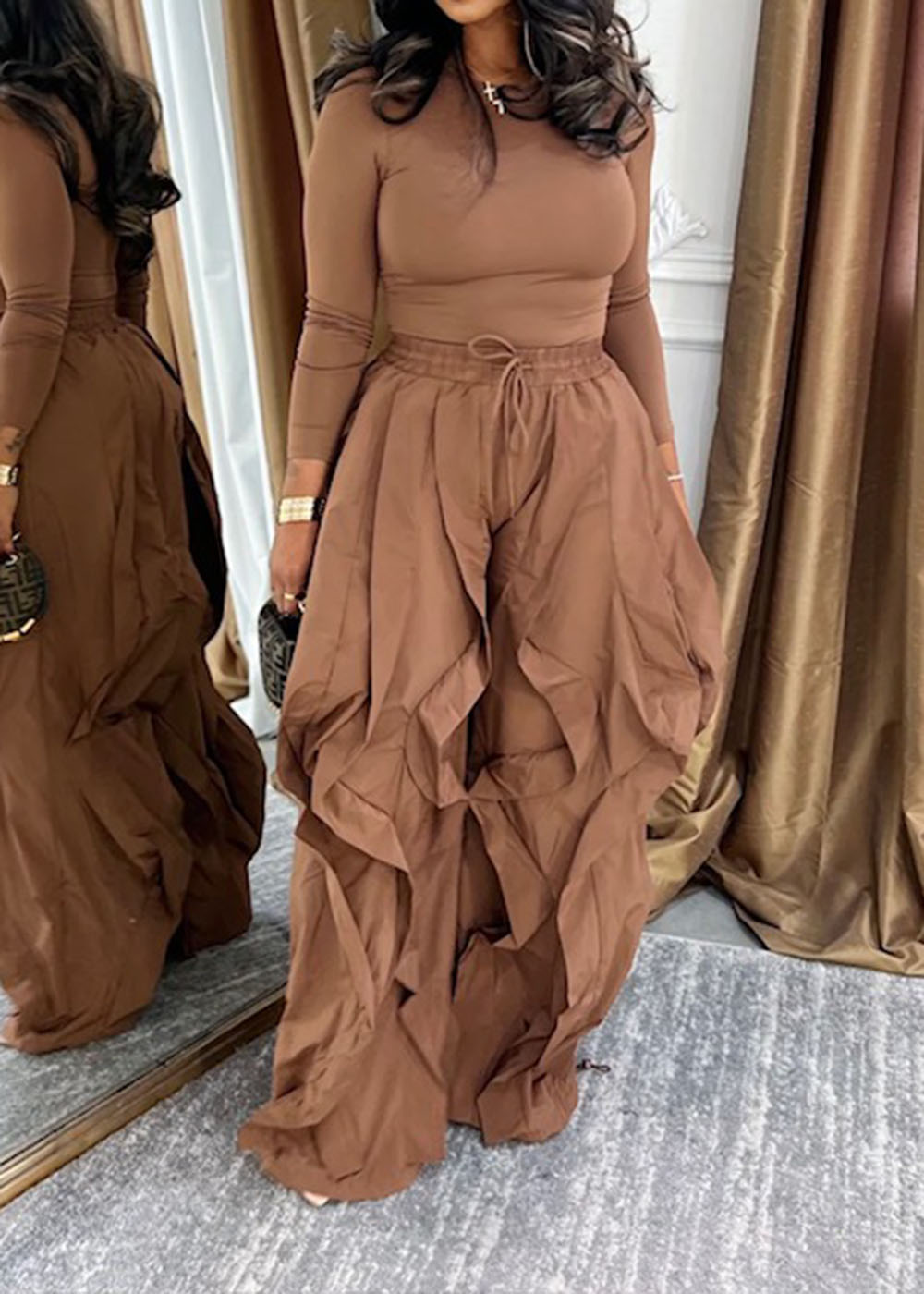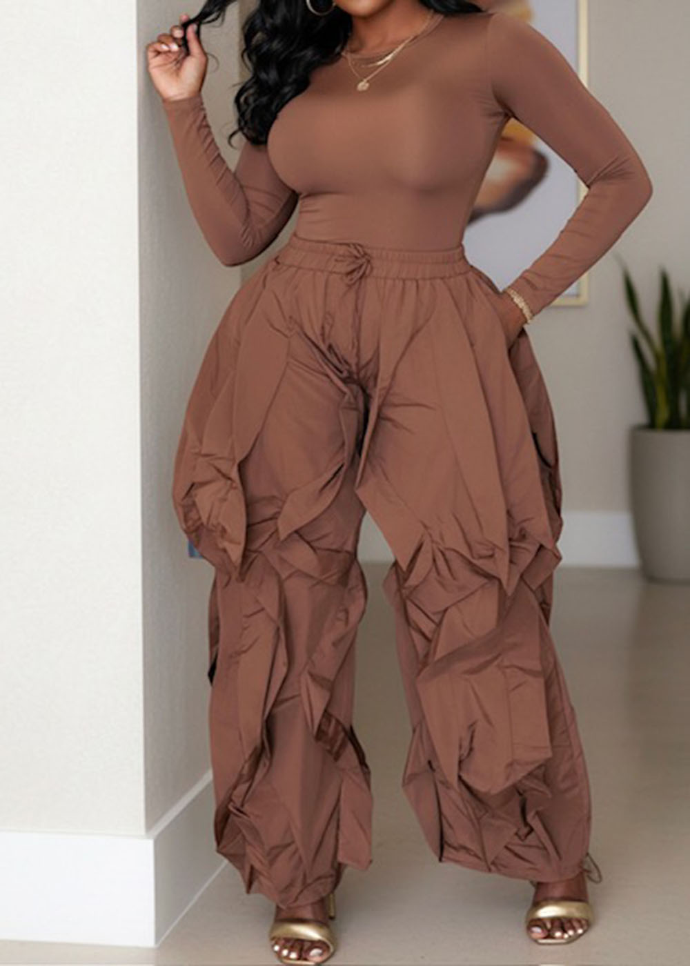 Hot Cocoa is your answer to elevated ease. This two-piece set blends a sleek, stretchy long-sleeve bodysuit with oversized ruffled pants that move beautifully with every step. The warm cocoa tone delivers quiet luxury, while the relaxed structure keeps it wearable from day to night. It’s effortless, flattering, and designed for women who like their comfort styled.