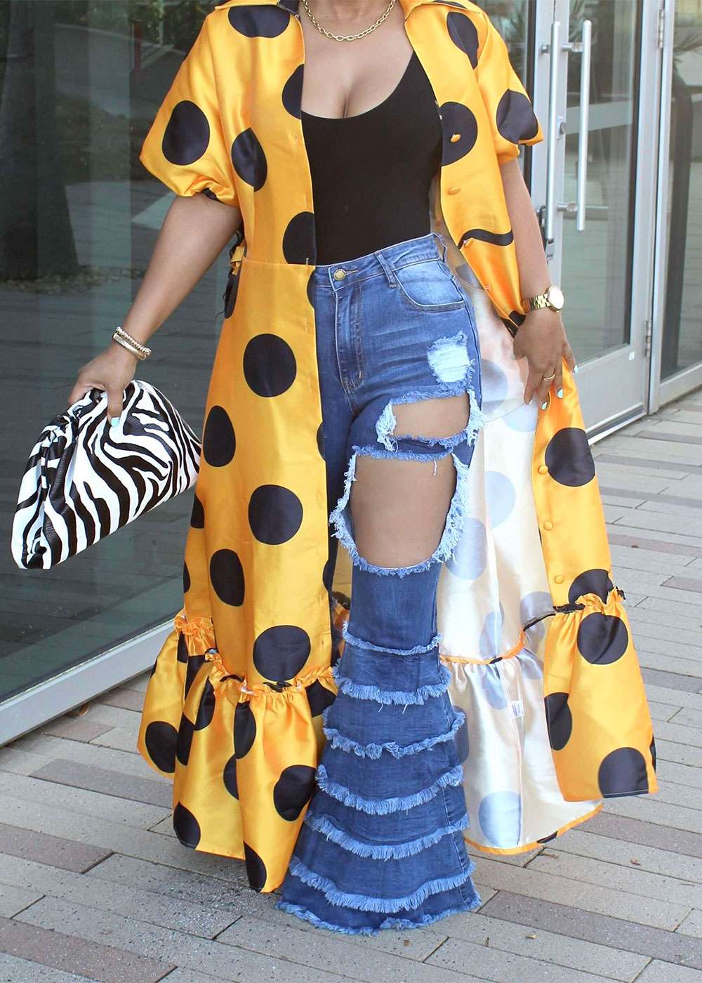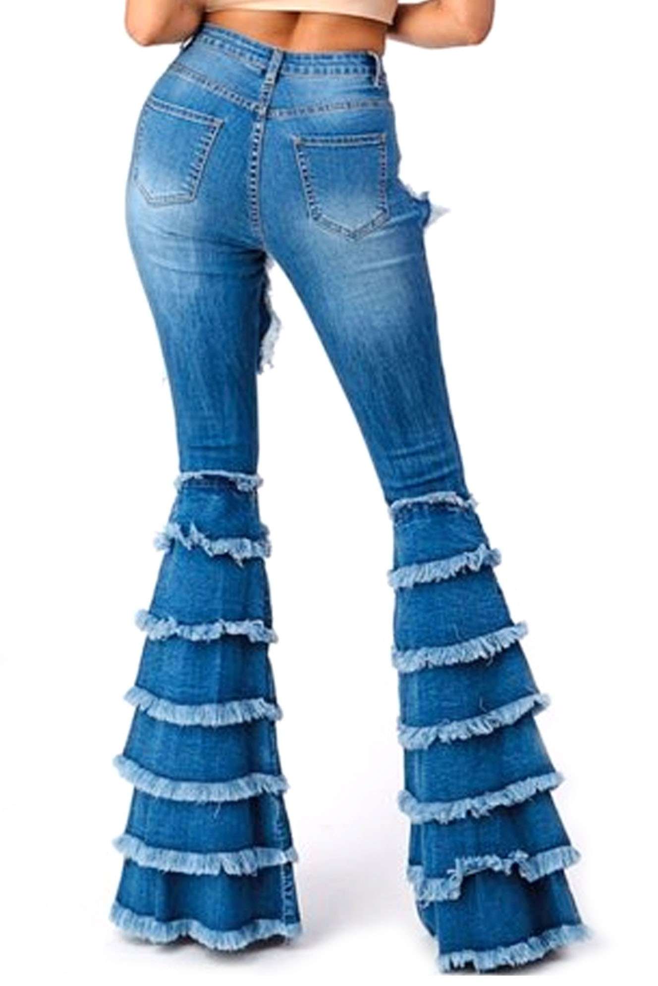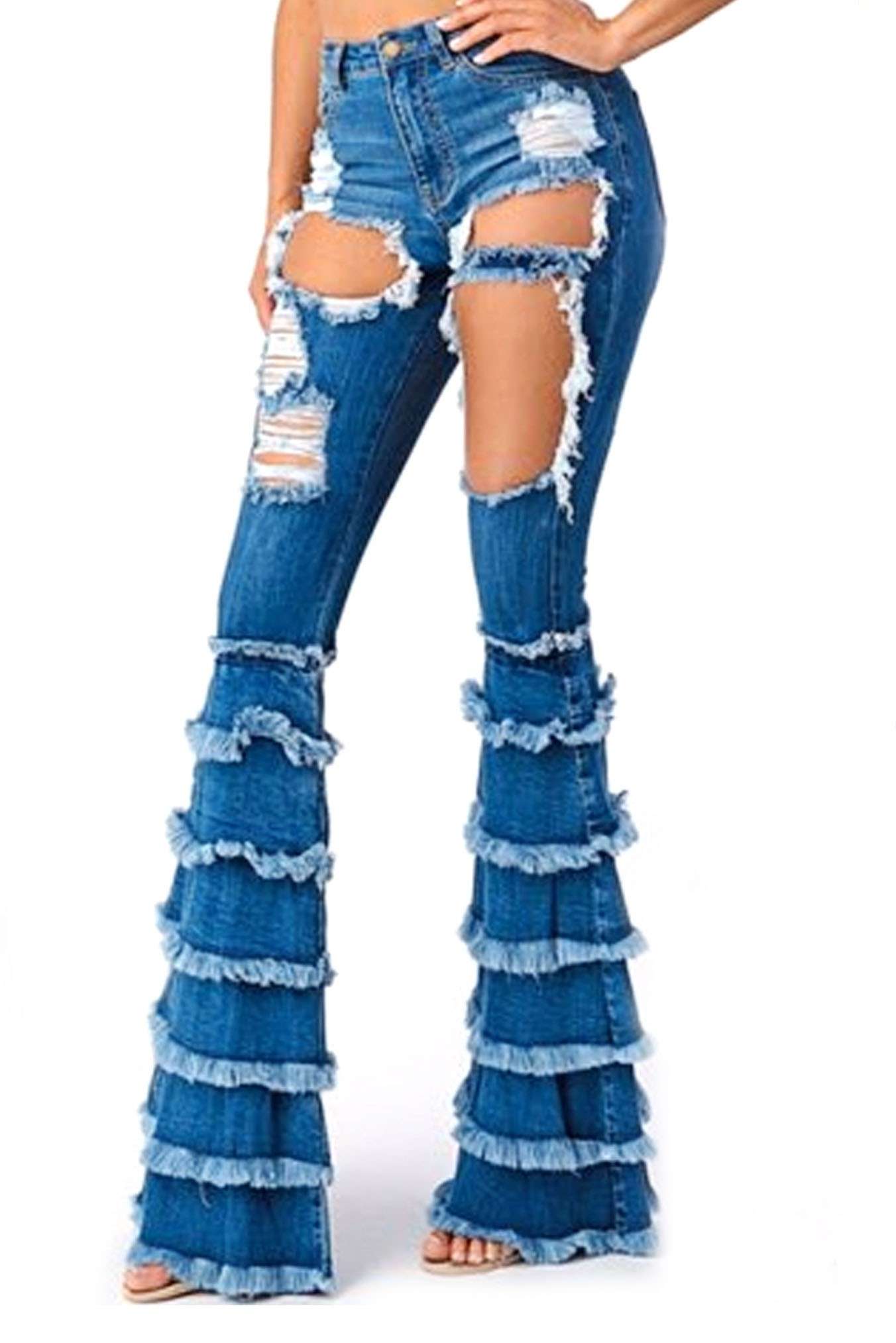 When it’s time to shut the scene down off the rip, these jeans speak volumes without saying a word. Made for the bold and unapologetic, these ultra-distressed, high-rise denim pants combine fierce confidence with wild-edge detailing. From the thigh-high rip to the exaggerated tiered flare, this piece is drama, movement, and boss energy all in one.