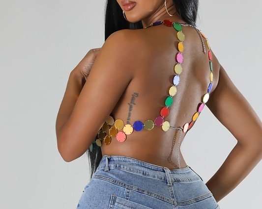 Perfect for a night out, a festival, or any occasion where you want to stand out, the “Over The Rainbow” top is designed to make you feel confident and fabulous. The halter neck style offers a flattering fit, while the open back adds a touch of allure.