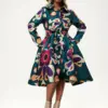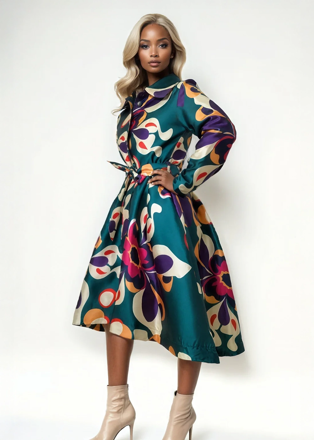 Meet the statement dress that plays by its own rules. This exclusive midi dress features a button-down, jacket-style front with covered buttons, long sleeves, and a sharp collared neckline for that polished finish. The pleated waistline flatters the silhouette while the hi-lo hem adds graceful movement with every step. Crafted with functional pockets (because style and utility belong together), the vibrant floral print brings modern femininity to a classic shape — perfect for everything from brunch to boardroom to after-hours flair.