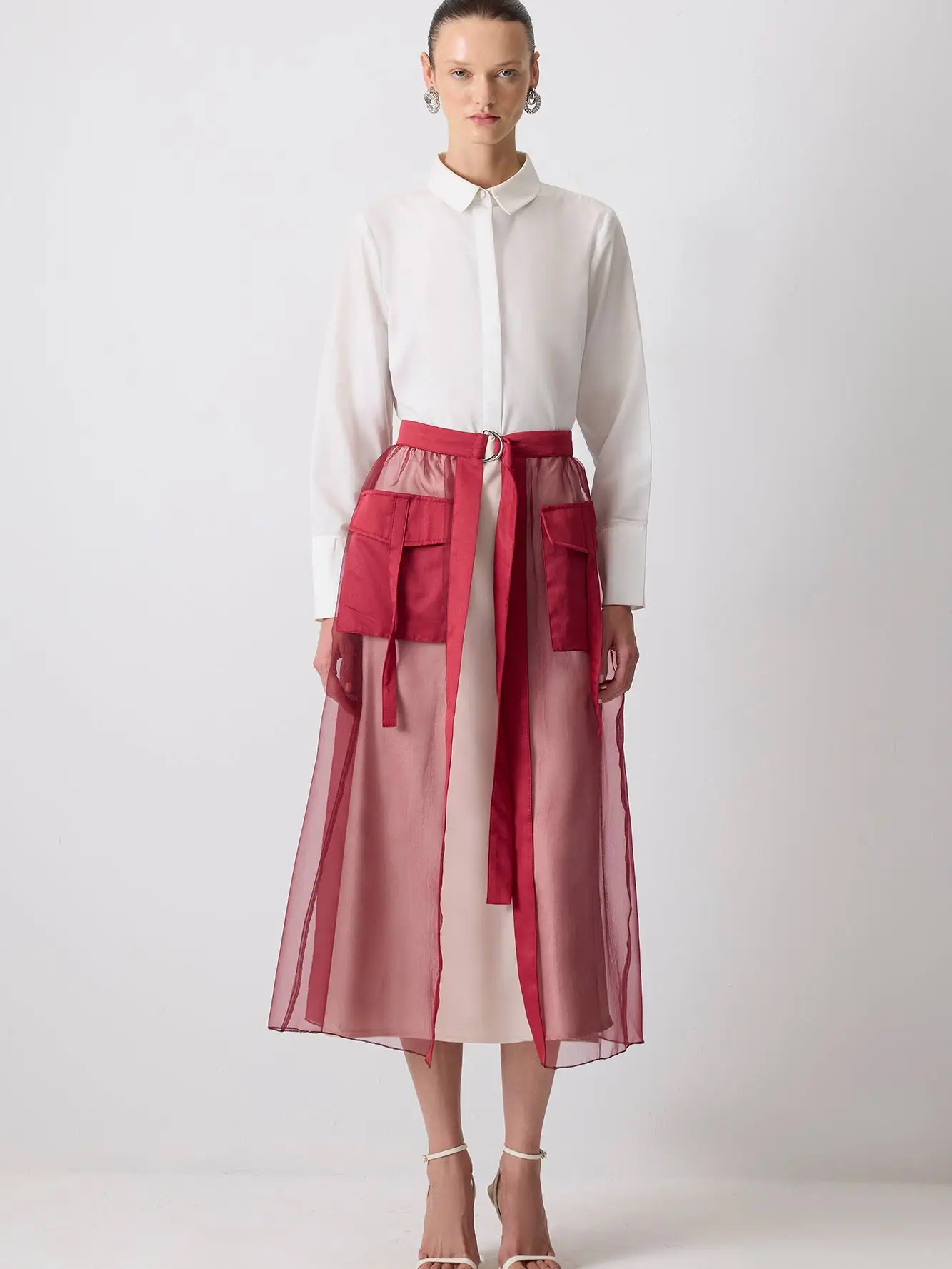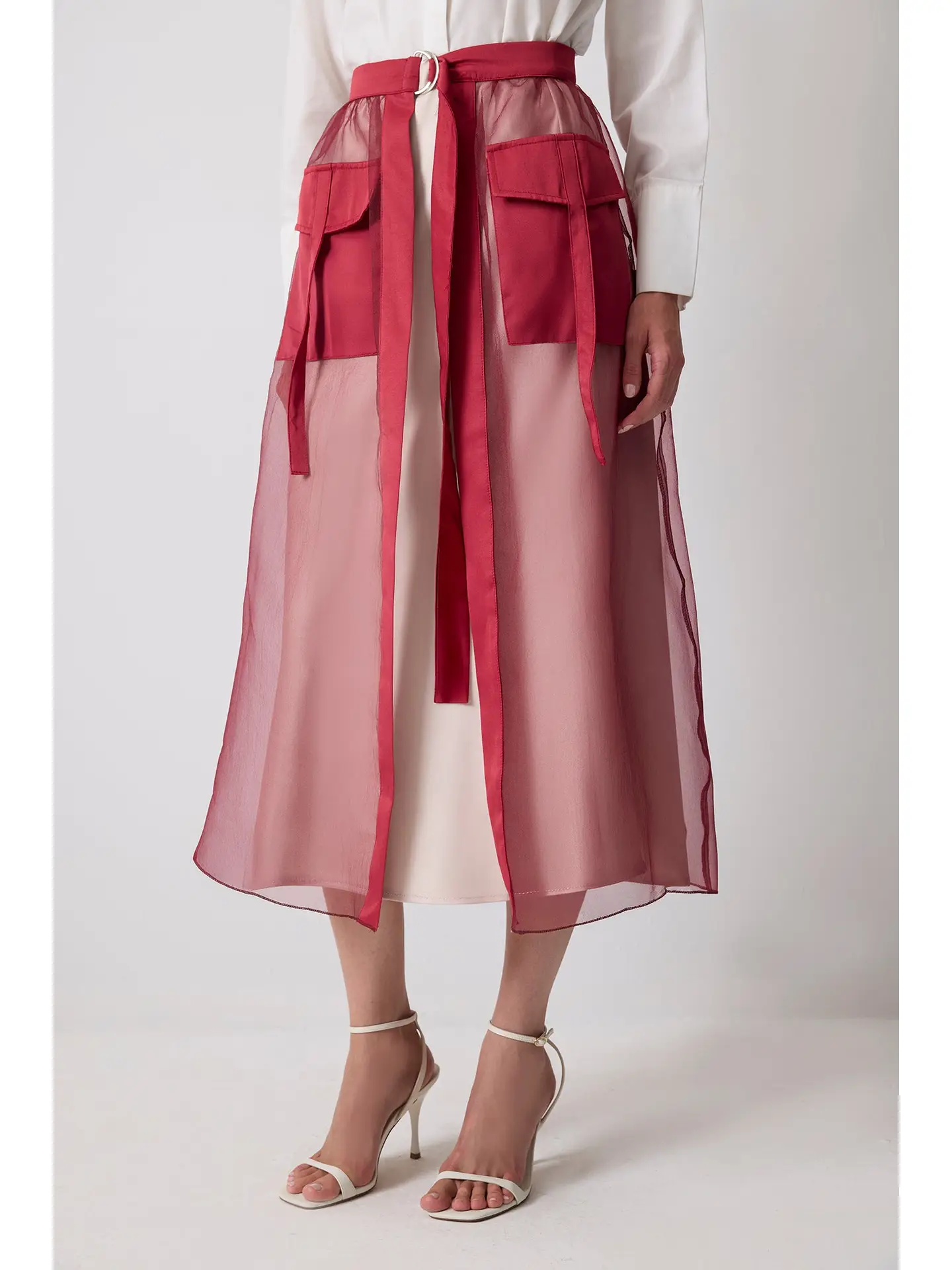 Make a dramatic entrance with the “Sheer My World” skirt—a bold fusion of elegance and edge. This organza overlay features a sheer burgundy layer that floats with every step, while the structured base and oversized front pockets keep it grounded in utility. The high-rise waist cinches in with a wide self-tie belt, accented by a metal ring detail for just the right amount of hardware. The open front wrap design brings flow and flirtation, making it perfect for layering over fitted dresses, bodysuits, or tailored trousers.