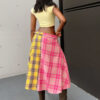 The “Shirt Skirt” is where edgy meets unexpected. Designed to look like two shirts morphed into one bold skirt, this piece is all about breaking rules. Flannel-like softness, bold button-up detailing, and an extra pop with that shirt collar finish. Add a necktie as a belt if you really want to push the vibe. Available in pink/yellow plaid or brown stripe/plaidcombos — because regular skirts are boring.