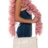 The standout feature is the extravagant, ruffled pink tulle strap, adding a touch of whimsy and making this handbag an eye-catching statement piece. The strap is both removable and adjustable, offering versatility in how you wear it – draped over the shoulder for a bold look or carried as a clutch for a more refined appearance.