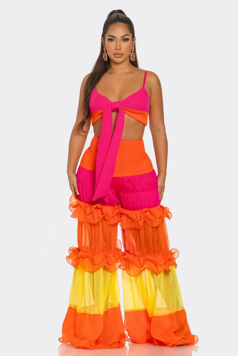 Say hello to your next showstopper. The Sunset Set brings the drama and the ease—just how we like it. Designed with a flowy, high-waisted pant and a cropped tie-front blouse, this set moves like a breeze and glows like golden hour. The bold sunset-hued print turns every sidewalk into your runway, while the breathable fabric keeps it light, cool, and carefree.