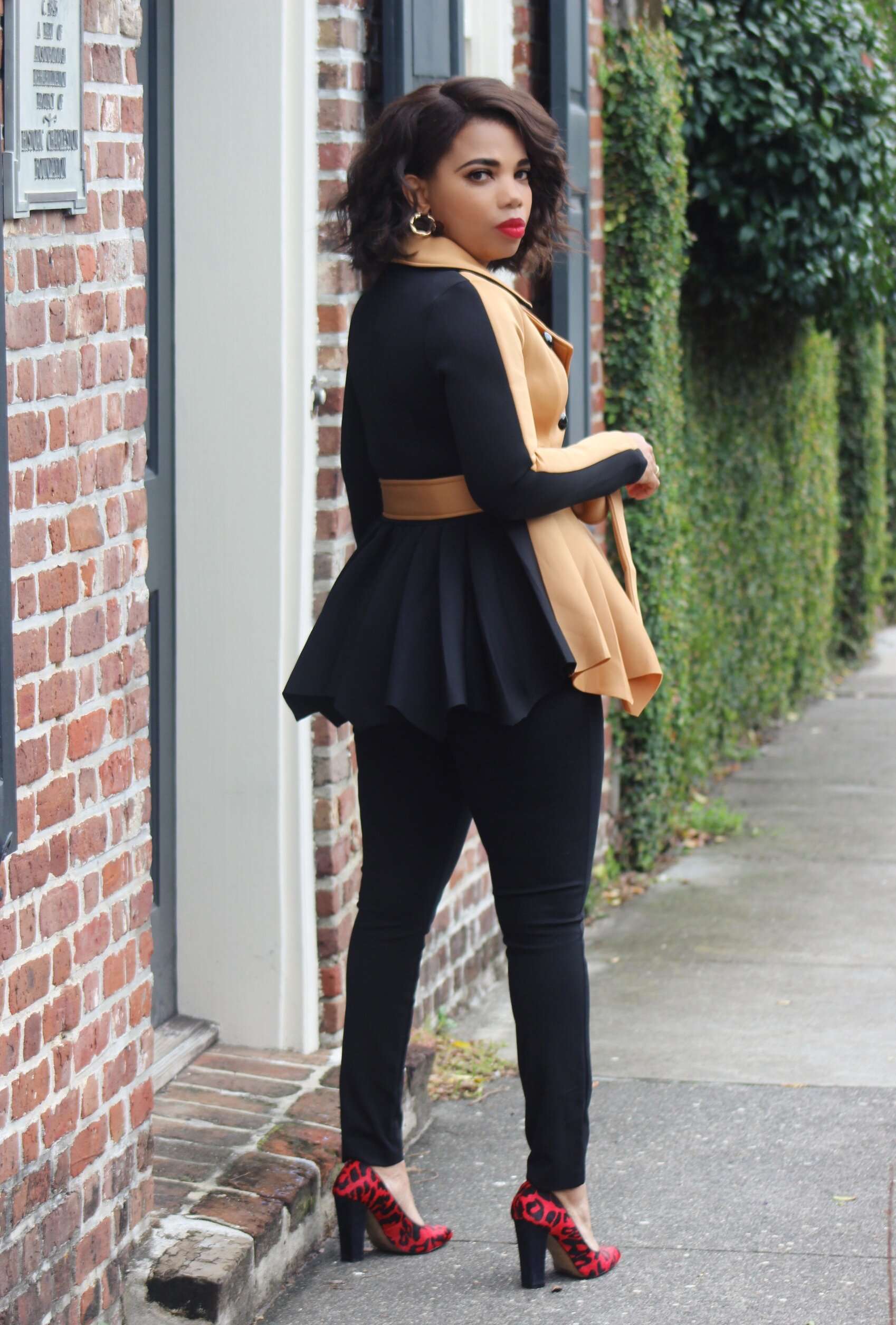 - Front: This variation features a sophisticated camel front with a double-breasted design and sleek black buttons. The fitted bodice transitions into a beautifully flared peplum hem, creating a flattering silhouette.